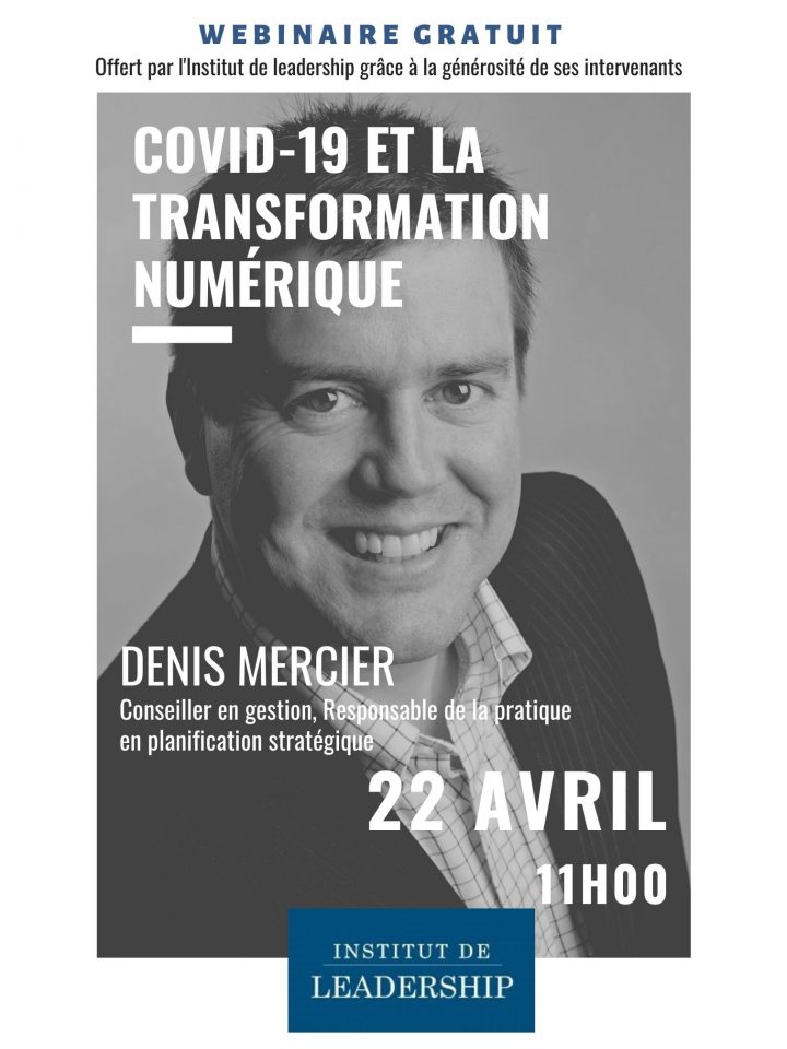 Si vous désirez écouter le webinaire : COVID-19 et la transformation numérique, cliquez ICI Pour télécharger le document pdf, cliquez ICI Un grand merci à Denis Mercier pour ce webinaire.