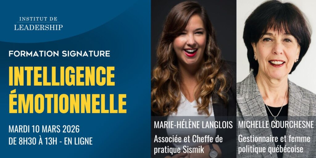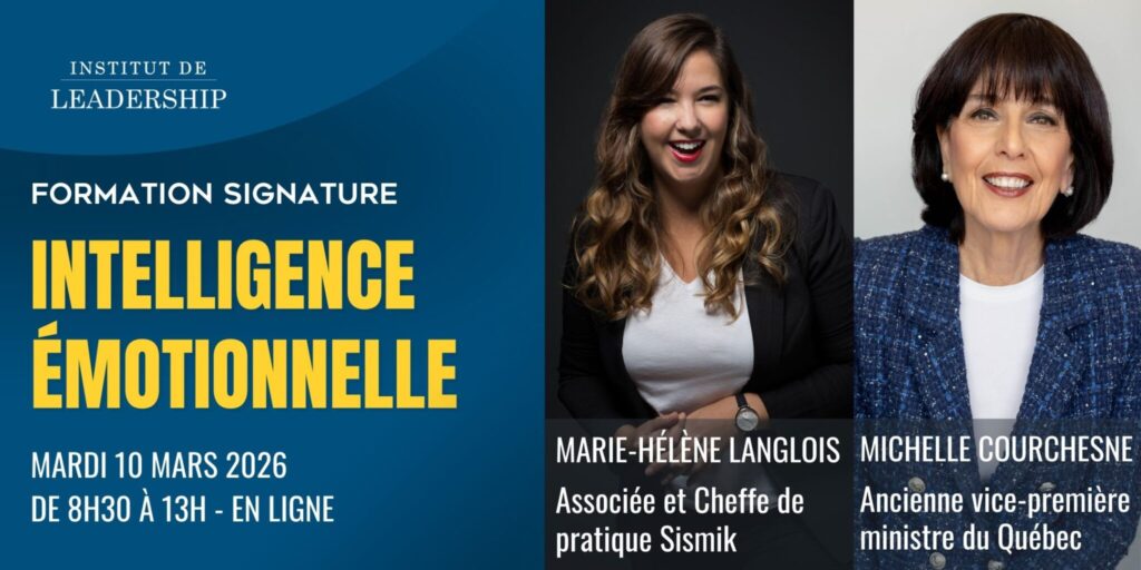 Animée par Marie-Hélène Langlois, formatrice et experte en développement du leadership, cette formation propose une approche structurée et ancrée dans la réalité des gestionnaires. Vous bénéficierez également du témoignage de Michelle Courchesne, conférencière reconnue, qui partagera des situations concrètes illustrant l’impact de l’intelligence émotionnelle dans les rôles de leadership et de gestion.