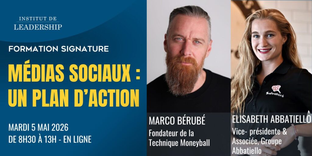 Animée par Marco Bérubé, entrepreneur et fondateur de la Technique Moneyball, cette séance propose une approche concrète et orientée vers l’action. Vous entendrez également le témoignage de Elisabeth Abbatiello, vice-présidente aux communications et au rayonnement et associée du Groupe Abbatiello, qui partagera des retours d’expérience sur la mise en œuvre de stratégies sociales efficaces dans des contextes organisationnels exigeants.