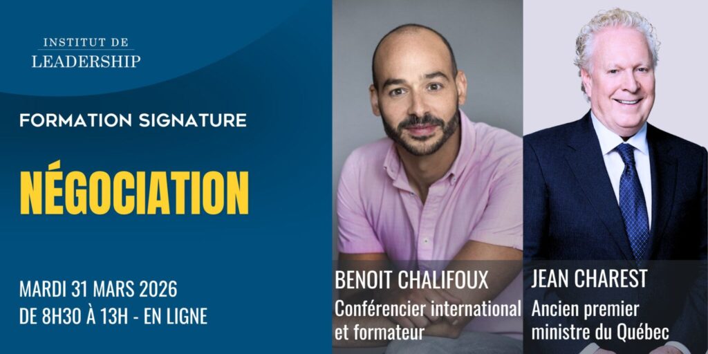 Animée par Benoît Chalifoux, conférencier international reconnu pour son expertise en soft skills, en négociation, en vente et en leadership, cette séance propose une approche dynamique, concrète et orientée vers l’action. Vous entendrez également le témoignage de Jean Charest, associé au bureau de Montréal de McCarthy Tétrault, qui partagera son expérience terrain et son regard stratégique sur la négociation dans des contextes politiques, économiques et organisationnels complexes.