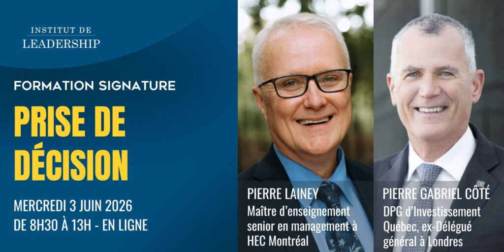 Animée par Pierre Lainey, maître d’enseignement senior à HEC Montréal et expert reconnu en comportement décisionnel, cette séance propose des outils concrets et des exemples issus de situations réelles. Vous entendrez également le témoignage de Pierre Gabriel Côté, ex-délégué général du Québec à Londres et PDG d’Investissement Québec, qui partagera des situations vécues où la prise de décision stratégique et la gestion du changement ont permis de surmonter des contextes complexes et d’atteindre des résultats significatifs.